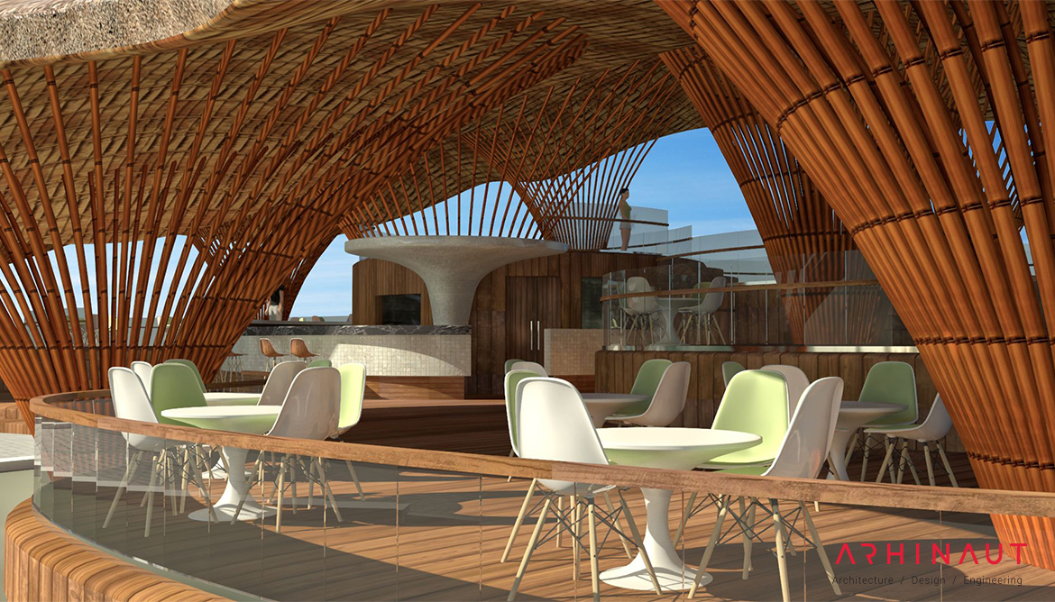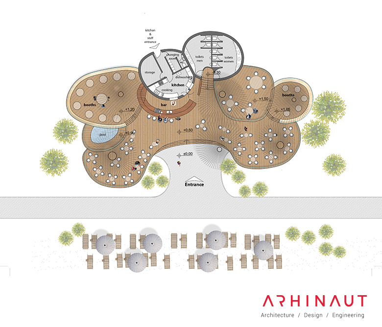 The cafe is located on the coast of Ada Ciganlija Lake in Belgrade. It covers area of 500m².
